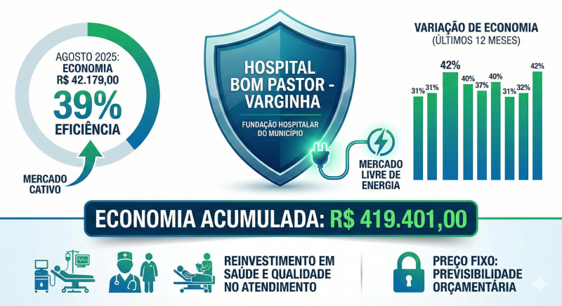A Fundação Hospitalar do Município, apresenta resultados expressivos na gestão de custos operacionais do Hospital Bom Pastor. Graças à migração para o Mercado Livre de Energia, a instituição alcançou uma economia acumulada de R$ 419.401,00 ao longo da vigência do contrato atual.